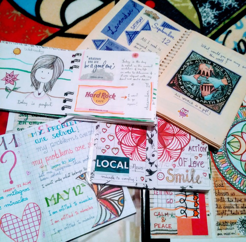 Tengo un diario de dibujos (journal) en donde cada día escribo lo que quiero experimentar y trazo algo relacionado con esa intención. Ha sido una experiencia fascinante. Ahora cada dia realizo una actividad artística en mi cuaderno reciclado,